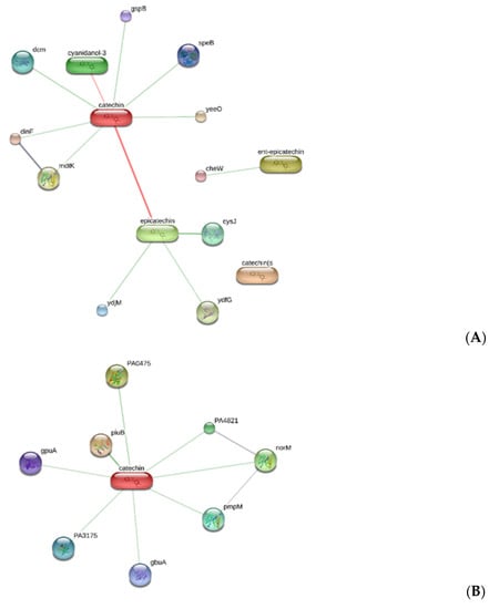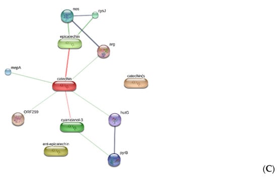 Considering the promising antimicrobial activity by the ethyl acetate extract, a bioinformatics analysis was conducted through the platform STITCH, with the aim to identify microbial proteins that could be key targets of catechin. Specifically, the bioinformatics analysis predicted microbial proteins involved in the resistance to chemotherapic drugs, including the multidrug efflux system transporters of E. coli (mdtK) and P. aeruginosa (pmpM), and S. aureus β-lactamase (ORF259) (Figure 3).