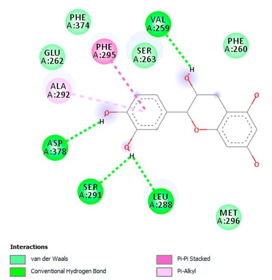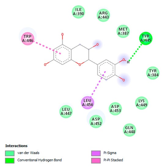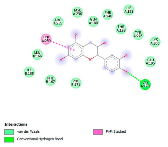 Meanwhile, the docking analysis showed the micromolar binding affinities of catechin towards these microbial proteins, further supporting the observed antibacterial activities exerted by the ethyl acetate extract (Figure 4, Figure 5 and Figure 6).