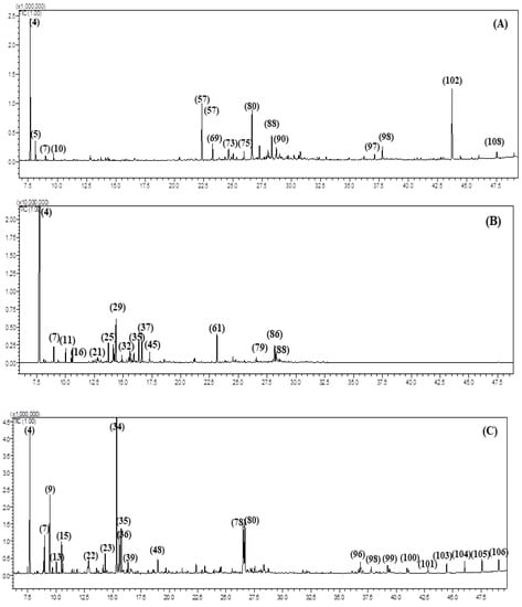 GC-MS chromatograms of F. samarcandica (A), F. tenuisecta (B) and F. varia (C).