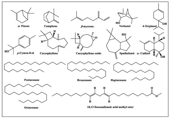 Essential oils comprise a mixture of secondary metabolites, which are biosynthesized by aromatic plants as natural protectants [1]. The role of essential oils is not restricted to protection as they also offer many therapeutic benefits to humans that can exceed the benefits provided by the dried herbs on their own [2]. Recently, they have become well known as a part of traditional medicine for the treatment of a plethora of human ailments, in aromatherapy, as well as in spices with high nutritive value [3]. In addition, many essential oils as well as plant extracts have shown significant antioxidant potential [4,5,6]. New sources of medicinal agents that are effective and safe as well as selective has recently become the main target in drug discovery. Medicinal plants in general, and their volatile constituents in particular, act as a very important sources for the production of a huge number of biologically active agents, which are attractive chemical leads that are promising therapeutic agents for the alleviation of many ailments [7,8]. Many biological activities have been ascribed to the volatile constituents obtained from a variety of plants such as antinociceptive, anticancer, antiphlogistic, antiviral, antioxidant, antimicrobial, antimycotic, antiparasitic and insecticidal activities [9]. Moreover, the volatile constituents of plants are highly popular in the food, cosmetic and pharmaceutical industries because of their broad acceptance by consumers, relative safety, and their potential multipurpose effect [10,11].