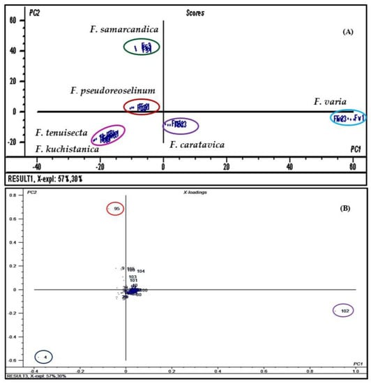 Score plot (A) and loading plot (B) of GC data obtained from F. caratavica, F. kuchistanica, F. pseudoreoselinum, F. samarcandica, F. tenuisecta and F. varia essential oil analyses using principal component analysis (PCA). In the loading plot, compounds are given numbers as in Table 1 where the major discriminatory signals are α-pinene (4), palmitic acid (95) and 10,13-docosadienoic acid methyl ester (102).