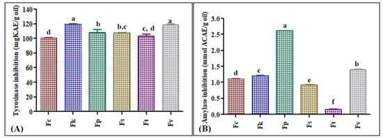 In vitro tyrosinase inhibition (A) and α-amylase inhibition (B) of the essential oil of different Ferula species, F. caratavica (Fc), F. kuchistanica (Fk), F. pseudoreoselinum (Fp), F. samarcandica (Fs), F. tenuisecta (Ft) and F. varia (Fv). Different letters (a–f) indicate significant differences in the tested Ferula species (p < 0.05).