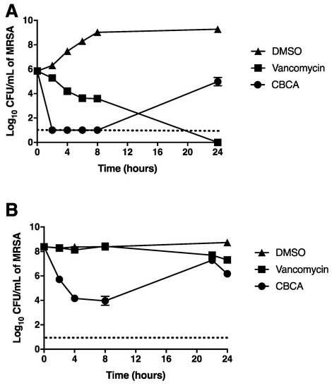 Time-dependent killing of methicillin-resistant Staphylococcus aureus (MRSA). MRSA was grown to OD600 0.001 (A) or 0.6 (B) and incubated with cannabichromenic acid (CBCA) (40 µM), vancomycin (30 µM), or DMSO (1%). At indicated time points, aliquots of cultures were serially diluted and plated for enumeration of viable bacteria (CFU/mL). Error bars represent the standard error obtained from triplicate samples. Dashed lines indicate the level of detection.