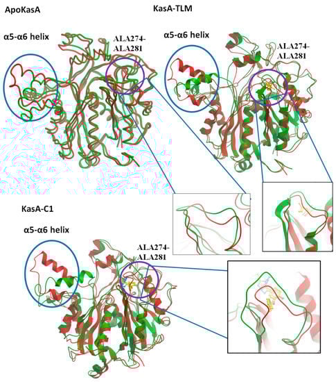 - Schaefer, B.; Kisker, C.; Sotriffer, C.A. Molecular dynamics of Mycobacterium tuberculosis KasA: Implications for inhibitor and substrate binding and consequences for drug design. J. Comput. Aided Mol. Des. 2011, 25, 1053–1069. [Google Scholar] [CrossRef] [PubMed]