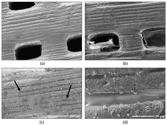 Figure 1b–d show the micrographs of a pellet coated with a 1% alginate–CaCl2 hydrogel. The alginate–CaCl2 hydrogel is an ionically-cross-linked one. Alginate that is negatively charged combines with the Ca+2 forming an insoluble complex [25]. Indeed, the presence of this complex on the pellet surface is well represented, as shown in Figure 1c by the black arrows. Certainly, the alginate–CaCl2 hydrogel covered the entire pellet surface, but, as explained before, the vacuum created in the vacuum chamber, used to deposit the Ag on the pellet surfaces, undeniably changed the shape of the alginate–CaCl2 coating. In the SEM images, this was visible only in the hollow formed due to the printing technique.