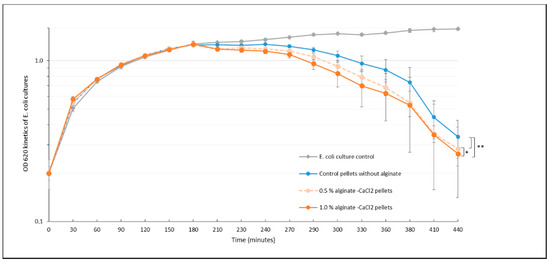Lytic kinetics of bacterial cultures in the presence of phage-loaded β-TCP pellets coated with different alginate concentrations after 3 h of washing in LB (37 °C, 170 rpm) (n = 3 × 2). *, Significantly-similar groups of results and **, significantly-different groups of results with p-value < 0.05. The grey kinetic corresponds to the results for the control culture of E. coli.