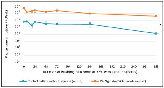 As expected, the alginate–CaCl2 hydrogel showed a positive influence on the initial phage concentration in the pellets. In fact, the 1% alginate–CaCl2 hydrogel allowed a phage concentration 1 log higher than on the uncoated control pellets. Compared to the initial concentration observed on the pellets by Meurice et al. [21], it was significantly higher, demonstrating an important retention action of the alginate–CaCl2 hydrogel of the phages into the ceramic pellets.