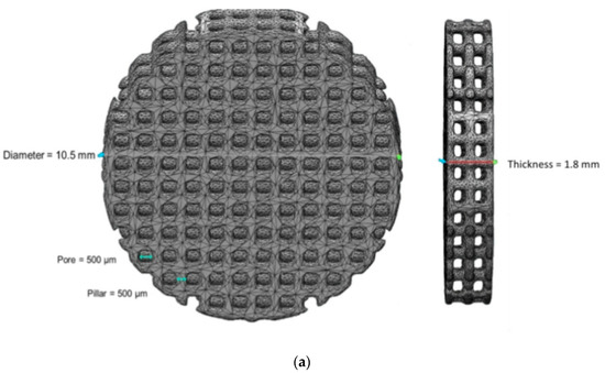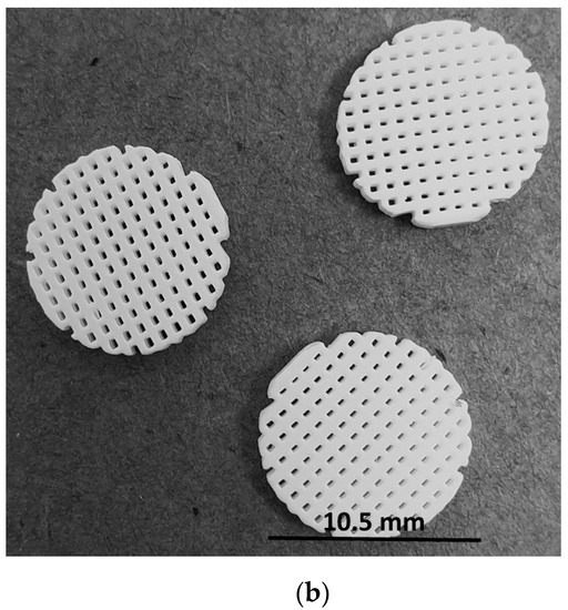 Synthetic β-Ca3(PO4)2 (β-TCP) powder was prepared by aqueous precipitation using di-ammonium phosphate solution (NH4)2HPO4 (Carlos Erba, Val de Reuil, France) and calcium nitrate solution Ca(NO3)2·4H2O (Brenntag, Tournan en Brie, France) at 35 °C and pH 6.4 with an initial Ca/P molar ratio of 1.5 and an aging time of 20 h [28]. After filtration, the solids were dried at 80 °C and then calcined at 850 °C. To reduce the powder particle size, the powder was ground for 3 h in a ball mill using a high-density polyethylene (HDPE) milling jar and yttrium-stabilized zirconia grinding media. The macroporous sample models (10.5 mm-diameter round disk and 1.8 mm thick, 500 µm macro pores size) were designed by CAD software (Figure 4a). The models were then sliced (layer thickness = 50 μm) using Creation Workshop software (Datatree3D, Dallas, TX, USA). The data were transferred to the SLA software and equipment (CryoCeram Printer; CryoBeryl Software, Bry, France) for additive manufacturing. The pellets were printed by stereolithography using a high dry matter content slurry (65% dry matter content w/w) prepared with the synthetic β-TCP and a photosensitive (λ= 350–400 nm) acrylic resin (CryoBeryl Software, France). The curing energy was set to 5 mW/cm2 with a slice thickness of 50 μm. Printing was followed by a series of washing steps in order to remove unpolymerized matter. The pellets were then thermally rebound and sintered at 1050 °C with a heating rate of 5 °C/min at atmospheric air. The printed pellets are illustrated in Figure 4b.