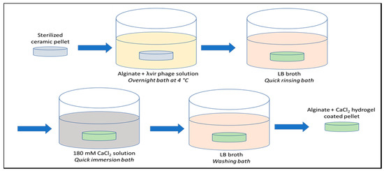 After a quick LB rinsing, the ceramic pellets were then immersed into a 180 mM calcium chloride (VWR ProlaboNormapur, Søborg, Denmark) solution, as the gelling agent for alginate coating. After 3 h of washing bath in LB broth, the pellets were poured into tubes containing 10 mL of LB for the negative control or into a new two-generation culture of E. coli A324 at around OD620nm = 0.20 for assessing the lytic activity at 37 °C under 170 rpm shaking. The washing effect in LB broth was evaluated for 0, 3, 6, 18, 24, 48, 72, 144, and 288 h for the control pellets and the 1% alginate–CaCl2-coated pellets.
