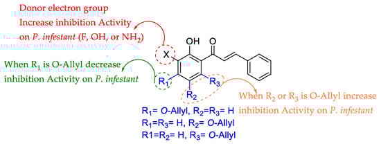 The most active compounds of the series are 7a, 8a, and 9a; while these compounds have a similar molecular surface, the atomic charge on C3′ is different due to the substitution pattern (see Table S2). Thus, new compounds with substitution on C3′ were calculated using the compounds 7a, 8a, and 9a as core (see Tables S3–S5). These new compounds differed in calculated pIC50, depending on the stereo-electronic properties. For example, using compounds 7a, 8a, and 9a as the core caused the electronegative substituent –F, –OH, and NH2 bonded to C3′ to increase in positive atomic charge, allowing for increased inhibition growth activity against P. infestans (see Tables S3–S5). Interestingly, the derivatives calculated from 7a showed less activity than derivatives from cores 8a and 9a. This phenomenon is likely related to substituent proximity in the 7a derivatives, which causes stereo-electronic repulsions (see Tables S3–S5). Thus, the most active compound against P. infestans (8a, see Table 1), the most promising substituents for the inhibition activity of 2-hydroxychalcones against P. infestans bonded to C3′ were –F and –OH, which allow for ~1.7-folds.