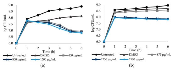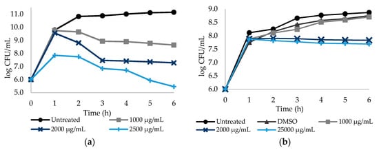 Colony forming units (CFU) were counted after the incubation period, and the results were expressed in log CFU/mL. At least three independent experiments were performed for each condition. Logarithmic reduction values were calculated for t = 6 h, according to Equation (1):