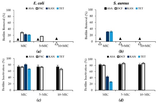 Effects of PXC (piroxicam), DCF (diclofenac sodium), ASA (acetylsalicylic acid), at three different concentrations (MIC, 5× MIC and 10× MIC) and KAN (kanamycin) and TET (tetracycline) at MIC (in this case, 5× MIC and 10× MIC were not tested) against E. coli and S. aureus after 24 h of exposure in terms of: (a,b) biomass removal (%) and (c,d) biofilm inactivation. ▲/∆ represents 0% biofilm removal. Mean values ± SD of three independent experiments are illustrated.