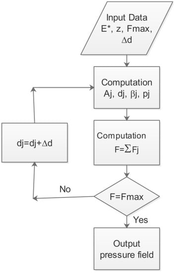 For a given initial separation d, the local displacement dj, the local contact area Aj, and the average attack angle βj of each asperity can be determined. These parameters allow the distribution of the pressure and the real contact area undergone by the roughness to be determined. For a macroscopic displacement, the two surfaces are progressively brought to contact with several displacement increments Δd of the smooth rigid plane. The displacement is interrupted when the resulting effort F reaches the imposed normal effort FMAX (i.e., the convergence of the numerical software is reached).