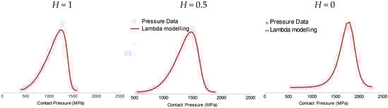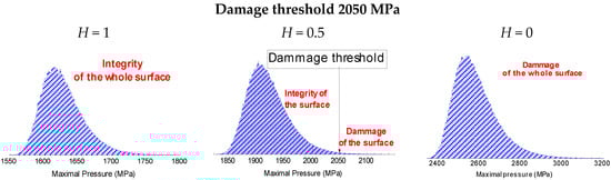 As it can be observed on Figure 6, when the fractal dimension of the surface increases, the maximal local pressure increases. This is due to the fact that peaks become smaller for low Hurst exponents which drastically increase the local pressure and then the local probability of damage. Bowden and Tabor [], assumed that in order for the bodies to slide relative to each other, the asperities are plastically deformed; i.e., the mean pressure corresponds to its hardness (and also near three times the yield pressure of the material). If one supposes for example that the hardness of the material is equal to 2050 MPa, then for H = 1, the probability of damage is impossible, for H = 0.5 this probability is equal to 1% and for H = 0 the probability of surface damage is one meaning that damage is certain.