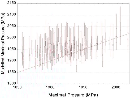 The 90% confidence intervals of modeled data by the Lambda distribution for the maximal pressure versus the pressure data values. The straight line represents y = x.