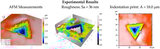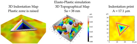 However, it is essential to validate the proposed methodology. In fact, our model is based on the probability of having the first peak that plastifies and to associate its contact pressure. The criticisms of our methodology that can be formulated are on the one hand, a simplistic model of contact simulation (justified by the large number of high-resolution simulations, discretization necessary to capture the morphology of the highest peaks) and on the other hand the difficulty of validating this methodology by a reasoned approach. To have a less critical modeling of the material’s behavior, finite element simulation seems tempting but remains complex at the level of elementary numerical operations. Even if this would prove possible in a reasonable time of calculations with the resolutions proposed in this article, it would prohibit us from future investigations on larger topographic resolutions (e.g., multi-fractal surfaces). Therefore, it is necessary to validate our approach without having to simulate our methodology by replacing our semi-analytical calculation with an MEF method. It is therefore necessary to build a methodology independent of the contact simulation method to validate the plasticification of extreme roughness and to associate them with a localized contact pressure without recourse to numerical calculation. For this purpose, we will have recourse to the nano-indentation test with of a Berkovich indentor. The nano-indenter continuously monitors the evolution of the tip depression with the indentation charge during the charging and discharging phases to observe the plastic and elastic response of the material. The tip used on our equipment is a Berkovich tip (pyramidal geometry with a triangular base). The indenter Berkovich is a three-sided pyramid, whose base is an equilateral triangle. The faces have an inclination of 65.3° with respect to the vertical axis. This homothetic geometry, therefore, makes it easy to identify the plasticized area by indentation. This homothetic geometry therefore makes it easy to identify morphologically the plastic area. A sample of the TA6V (MTS NanoIndentor) previously polished with 80 grade abrasive paper to obtain a rough surface is indented. Then the indentation print is recorded by atomic force microscopy (Bruker). Figure 9 (left) shows the topography where the angles of the indenter in plastic contact are visible. The non-indentated roughness has an Sa of 36 nm and the side of the impression in contact is equal to 18 µm.