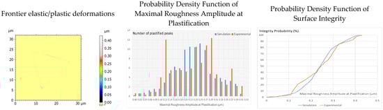 We will then postulate that at the elastoplastic transition boundary (see Figure 11 left) the pressure field is continuous due to the given shape between the surface and the indenter. This means that this boundary defines the transition zone and, therefore, the contact pressure is equal to the elastic limit of the materials. As a result, this boundary topography allows us to calculate the probability density function of asperities height at the beginning of plasticification. Figure 11 (center) represents this probability density function for the simulated and experimental plasticification frontiers for a given roughness height. As can be observed, the densities between the experimental and simulated measurement are quite close. It then becomes possible to determine the probability density of surface integrity (Figure 11, right). The experimental and simulated data are consistent, which validates the robustness of the simulation on a rough surface to detect local areas of first plastification.
