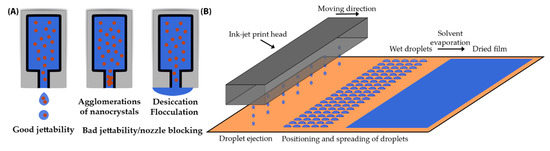 Schematic illustration (not to scale) of ink-jet printing of a YBCO nanocomposite film. (A) Careful adjustments of the jettability depending on the used inks. The agglomerations of nanocrystals and fast desiccation/flocculation of the solvent can lead to blocked nozzles or bad jettability. (B) Operating principle of a drop-on-demand ink-jet printing system above a substrate.