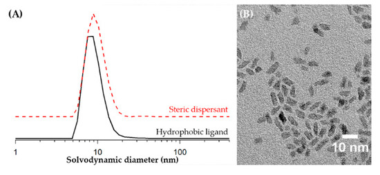 HfO2 nanocrystals after the synthesis with tri‑n-octylphosphine oxide. (A) Dynamic light scattering (DLS) analysis revealed a mean solvodynamic diameter of 10.2 nm in toluene, while the ligand exchange with a steric dispersant in 1-butanol resulted in a solvodynamic diameter of 10.7 nm. (B) TEM image indicating the nanorod-like morphology.