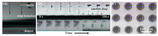 Drop visualization using Dimatix drop watch. (A) Jetting of two spherical pristine YBCO ink droplets from the nozzle in the air. (B) Time-resolved drop formation after the ejection of HfO2-YBCO ink in the air. A very small satellite droplet could be observed at t = 120 s (red dotted rectangle), which finally recombined with the main droplet. The blue lines are separated by 100 µm, and the time step in (B) is 15 s. (C) Optical images of the printed arrays on a LaAlO3 substrate with a separation of 100 µm. The contact diameter of the drops was in the range 70–80 µm.