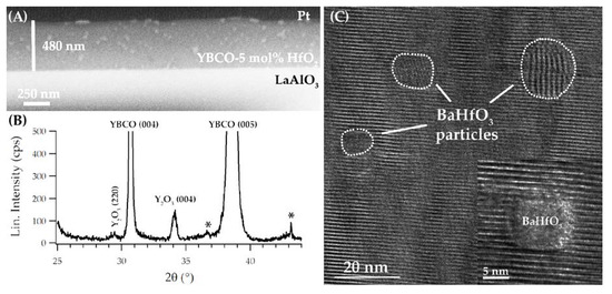 With the same printing conditions and one single deposition of 5 mol% HfO2-YBCO ink, films with a thickness of 150 nm after a full thermal process were achieved, as confirmed using a cross-sectional SEM (Figure S3B), which yielded an inductively measured Jc (77 K, sf) of 5.12 MA cm−2 and a corresponding Ic of 76 A (cm-width)−1. Here, a HfO2-YBCO nanocomposite film with a similar thickness of 450 nm, as described for the pristine YBCO film, was obtained after only three ink-jet deposition runs with a thickness of 480 ± 20 nm after a full thermal process, as confirmed in the cross-sectional SEM image shown in Figure 5A. Furthermore, this image shows a dense film with a dispersion of BaHfO3 particles (bright spots) throughout the film. In the XRD θ–2θ pattern of the 5 mol% HfO2-YBCO nanocomposite film (Figure 5B), two strong reflections of YBCO (004) and (005) and a weaker reflection of Y2O3 (004) were visible. The addition of preformed HfO2 nanocrystals resulted in self-field Jc values of 3.1 MA cm−2 and Ic values of 149 A at 77 K for the 480 nm YBCO nanocomposite film with three deposition runs. This enhancement of the self-field Jc for YBCO nanocomposite was likely due to the contracted Cu–O bonds, resulting in the increase of the pair-breaking energy [49]. The high-resolution TEM image of a HfO2-YBCO nanocomposite film (Figure 5C) shows BaHfO3 particles (indexed using the fast Fourier transform pattern, Figure S6) embedded in the YBCO matrix with mean diameters of 10.4 ± 3.9 nm. This means that HfO2 nanocrystals reacted with the Ba2+ ions, leading to the formation of BaHfO3 particles in the YBCO matrix. Nevertheless, our previous work [39] demonstrated that the reactivity of preformed ZrO2 nanocrystals results in a delay rather than in a degradation of the YBCO nucleation and growth. This growth delay can be circumvented via the introduction of an intermediate dwelling step, yielding an increase of Jc [39]. However, Pop et al. [34] has recently printed a low-fluorine-based YBCO precursor solution with additives on a LaAlO3 substrate with a final thickness of 0.6–1.2 µm via a single deposition, yielding a fairly good Jc value of 2.0–2.7 MA·cm−2 and an Ic value of 240 A at 77 K (Table 2). This work of Pop et al. shows that strict optimization of the nucleation and growth of thick YBCO nanocomposite films should be investigated for this HfO2-YBCO nanocomposite approach for power applications.