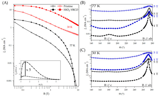 (A) Magnetic field dependence of Jc of the around 500-nm thick YBCO film with (closed symbol) and without (open symbol) HfO2 nanocrystal additions at two temperatures: 30 K (red) and 77 K (black). The inset shows the corresponding pinning force density Fp at 77 K. Angular dependence of Jc at 1 T (closed symbol) and 5 T (open symbol) at 77 K (B) and 30 K (C) for pristine (black) and HfO2-YBCO (blue) films.