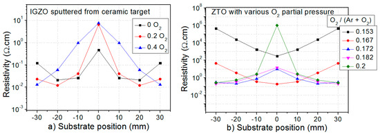 Variation of the InGaZnO (IGZO) (a) and ZnSnO (ZTO) (b) resistivity as a function of the substrate position with increasing oxygen supply.