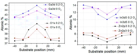 It seems that a significantly higher partial pressure is needed to oxidize the films located close to the substrate edges where not all the Ga has entered into the IGZO lattice sites but is partially segregated and has formed metallic Ga. Additionally, the chemical compositions of the films remain more or less stable at the substrate edges. However, starting at 20 mm from the substrate/target center, the concentrations of oxygen and gallium increase through the investigated volume of the material at the expense of indium and zinc. The observed lateral variations are heavily influenced by the composition and energy of the material flux towards the substrate.