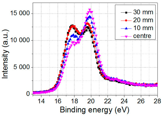 To explain the variation of resistivity across the substrate, detailed chemical bonding states of the elements and their respective concentrations were examined by XPS. The XPS measurements, shown in Figure 2, reveal significant variations in the distribution of the elements. There is an increasing concentration of oxygen and gallium towards the center, while zinc and indium have their minimum concentrations at the center. This phenomenon is even more pronounced with oxygen addition. Moreover, the gallium peak shows a change from metallic Ga (at 17.8 eV) to ceramic Ga2O3 (at 19.8 eV) with decreasing distance from the center of the substrate (see Figure 3).