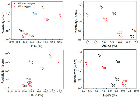 From the XPS analysis together with the resistivity measurements it can be concluded that zinc and indium atoms increase the conductivity whereas gallium and oxygen atoms give rise to an increased resistivity of the sputtered IGZO films. This is seen in Figure 4.