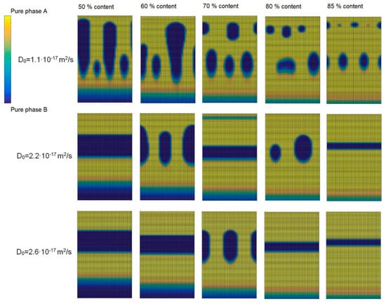 The calculated cross-sectional views of binary thin films at different diffusion coefficients and binary film compositions.