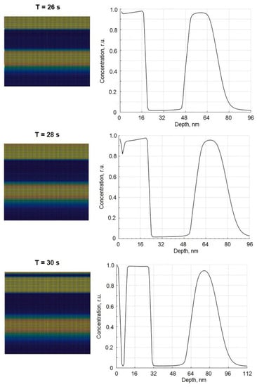In Figure 3, the dynamics of the formation of the third layer are analyzed (the formation of subsequent layers is analogous). At t = 26 s (see corresponding picture in Figure 3), the two layers of phase A are still observed (B as well), but the depth profile shown on the right side of that picture shows a small minimum in the concentration curve of component A. This means that component B starts to accumulate below the surface because the layer of phase B (existing in the bulk) now is too deep to diffuse there. At t = 28 s, this minimum becomes better expressed; the concentration of B at the depth of 2 nm is about 18%, which is higher than solubility 7.9 at %, so at that moment of time, the formation of the layer made of component B was in progress. Finally, at t = 30 s layer of component A splits into two layers with the layer of component B in the middle. Therefore, this process repeats forming layered of sandwiched binary film structures.