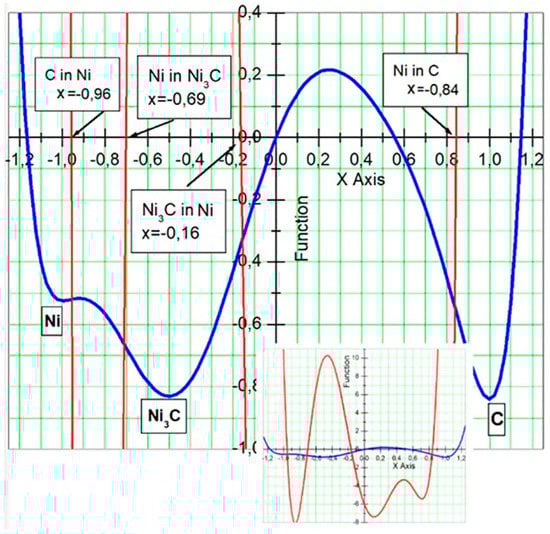 where c is a parameter, whose value c = 100 will be used in the calculations presented below. The plot of the function in form of Equation (6) is given in Figure 4 (blue curve) together with the fragments of the second derivative (red lines). The amplitude of the second derivative is very high comparing with the amplitude of the function, which is why it is difficult to show both functions in one picture. However, the second derivative is very important because, as it was mentioned earlier, it determines the solubilities of components. The full curve of the second derivative (in red) together with the function (in blue) is shown in inclusion of Figure 4. The given values of parameters a1, ..., a7 ensures the existence of the mentioned extremums at the given particular points: minimums at , and and local maximum at . The parameters a1, ..., a7 are fixed. Parameter c can be changed. Changes of parameter c do not affect the positions of the extremums. The difference between values of f(0.25) and f(1) and f(−0.5) (phases C and Ni3C, respectively) is directly proportional to c so that difference can be controlled by changing the value of c. The new function ensures that the formations of compositions corresponding to Ni3C and C are favorable during the phase separation because of the deeper minimum points of the function for those phases (this function directly related to the free energy) in comparison to the pure Ni phase at . As it was discussed above, the points where the second derivative reaches zero value (corresponding to the inflection points of function ) determine the solubilities of components. In Figure 4, we see that the second derivative of the function reaches zero values four times in interval [−1, 1], which means four different solubilities in the system. This is understandable, because now in the system we have three different pure phases of C, Ni and Ni3C. These values, which are related to the solubilities, are indicated in Figure 4 as the positions of the inflection points of the function in the ϕ axis. Because, the point ϕ = −1 corresponds to the pure Ni phase and the point φ = 1 (in the right side) represents the pure C phase, the solubilities of Ni are to the left of each minimum and the solubilities of C to the right of the minimums. The solubilities in terms of relative concentration can recalculated by using the relation between concentration c and phase ϕ: . Therefore, one can find the values of solubilities of different components defined by Equation (6): (1) The absolute value of (−1 − (−0.959))/2 ≈ −0.0205 corresponds to the solubility of C in the pure Ni; (2) (−0.5 − (−0.699))/2 ≈ 0.0995 is the solubility of Ni in the Ni3C phase; (3) the absolute value of (−0.5 − (−0.163))/2 ≈ −0.1685 is the solubility of C in Ni3C and (4) (1 − 0.844)/2 = 0.078 is the solubility of Ni in the pure C phase. Note that in previous case, when the function in form of Equation (2) was used, the solubilities of Ni in C or C in Ni were equal (function Equation (2) is symmetric), and the value of the solubility was 0.079; now it is 0.078.