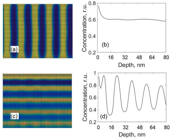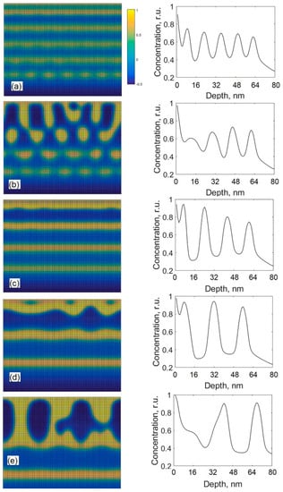 The influence of the surface segregation is shown in Figure 9 where the cross-sectional views and the depth profiles of carbon calculated at different values of the difference Wa – Wb are presented. The difference Wa – Wb denotes the difference between the surface energies of metal carbide phase and pure carbon phase. The surface segregation flux (to the surface layer from the bulk) is directly proportional to that difference. Results presented in Figure 9a,b were calculated using Wa – Wb = 4.8 × 108 J/m3. Results in Figure 9c,d were calculated using Wa – Wb = 9.6 × 108 J/m3, which was used in all the calculations presented earlier. The other model parameters were as follows: D0 = 3.5 × 10−18 m2/s, l = 10 nm. From Figure 9, it is seen that the formation of alternating layers is obtained by using the greater value of Wa – Wb, whereas the use of the lower value of Wa – Wb favors the growth of a columnar structure and, for depths greater than 8 nm, an almost uniform depth distribution of the segregating component is observed (see Figure 9b). In the given case, the use of the lower value of Wa – Wb promotes the lateral phase separation, which results in the formation of a columnar structure (if diffusion coefficient D0 is great enough). These results also show that the surface segregation can hinder the lateral phase separation, and this process can be important for the formation of a multilayered structure.