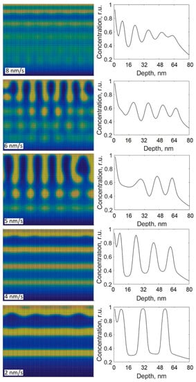 Previously, it was observed that the film growth rate significantly influences the structure of nanocomposites. Figure 8 shows the cross-sectional views and depth profiles of carbon obtained using different film growth rates (parameters in Equation (5)). The growth rate varies in the range from 2 to 8 nm/s. The value of D0 used in the calculations was 4.1 × 10−18 m2/s (the same as for Figure 7c, i.e., the case with well-expressed layers). All the other parameters were kept the same as previously stated. From Figure 8, it is seen that the multilayer structures were grown by using the growth rates of 2, 4, 8 nm/s, but at the highest rate of 8 nm/s, the depth distribution of thin film components are different from the ones obtained using the lower rates. From the depth profile, given in Figure 8, it is seen that the growth rate of 8 nm/s hinders the separation into pure phases, whereas the phase separation into the purer phases is observed at the rates of 2 and 4 nm/s. At the growth rates of 5 or 6 nm/s, the structures containing individual nanoparticles of various shapes are produced. Similar dependences of the phase structure on the growth rate are reported in the other theoretical works [,]. In Ref. [], it is shown that the thicknesses of alternating layers can be increased by decreasing the growth rate, which agrees with our calculations given in Figure 8 (rates of 2 and 4 nm/s). In Ref. [], it is shown that the change of the phase structure from a multilayered structure to that containing individual elongated nanoparticles can be obtained by increasing substrate temperature. This behavior can be seen in Figure 7. From Figure 7 and Figure 8, it is seen that the decrease in the film growth rate and the increase in the diffusion coefficient result in the similar effect on the phase structure, which suggests that the evolution of the phase structure is influenced by the ratio of D0 over growth rate.