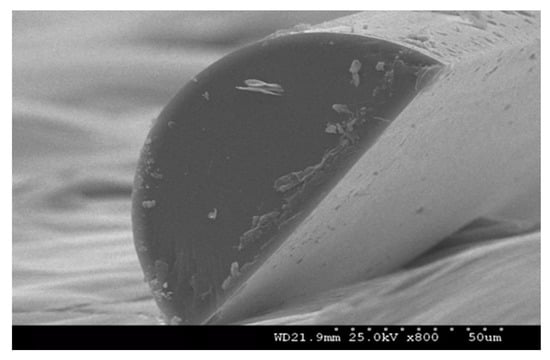 Before GZO coatings, the silicon wafer, glass substrates, and D-shaped fibers were ultrasonically cleaned. The D-shaped fibers were embedded and glued onto a coating substrate. Then, GZO thin film was coated onto the side-polishing fiber surface by using an RF magnetron sputtering method. The thickness of GZO film was 67 nm which was measured by a surface profilometer. The microstructure was analyzed by a scanning electron microscopy (SEM). Figure 2 shows the SEM micro-image of the D-shaped fiber coated with GZO thin film. In the present experiment, distilled water was used to avoid any type of contamination error. Similarly, the measured solutions that had different concentrations of sodium chloride (NaCl) were prepared. Two kinds of experiments were conducted in dilute NaCl solutions. The first kind was to detect the refractive indices (RI) of NaCl solutions from RI = 1.333 to 1.392. The RI of NaCl solutions was determined by an Abbe refractometer (DR-A1-Plus, ATAGO Co. Ltd., Kyoto, Japan) with a resolution of 1 × 10−4 for indices of 1.33 to 1.58. The second experiment was the salinity measurement. The proposed sensor was immersed in different concentrations of NaCl solutions with a range of salinities from 0% to 250%. This measuring salinity range is larger than the previously published papers for salinity measurements. The above fiber-optic sensing region was immersed into sensing solutions and the transmission spectrum date was analyzed by a computer program, respectively. The variation in the optical spectrum of the GZO film deposited on the side-polished fibers with different salinity solutions was measured. Figure 3 shows the schematic diagram of the experimental setup with a halogen light source, spectrometers, and a D-shaped fiber coated with GZO thin film. A white light source was linked to an LMR fiber-optic sensor with the other end attached to two spectrometers (both from Ocean Optics, USB 4000 and NIR 512). The output spectrum of the spectrometer was observed in the wavelength range of 350 to 1700 nm. In order to observe the wavelength shift of the LMR absorption peaks, the side-polishing section (about 30 mm) is immersed in different NaCl solutions. For salinity detection experiments, the sensitive region of the sensors was immersed into saline solutions at different salinity indices (0, 50, 100, 150, 200 and 250%). We changed the sensing solutions and analyzed the data measured by the optical spectrometer.