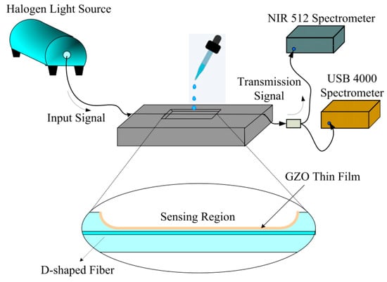 Two spectrometers (Ocean Optics NIR 512 and USB 4000, Ocean Optics Inc., Largo, FL, USA) were utilized to study both the visible light and the near infrared spectrum regions. The goal of high sensitivity can be reached by thinning the single mode fibers (SMF) to produce an evanescent wave to interact with the surrounding medium within the penetration depth. The D-shaped fibers must be polished precisely to form a smooth surface and to deposit GZO thin film. The core is very close to the flat surface of the D-shaped optical fibers. If a D-shaped fiber is polished to be thin enough, the evanescent wave can interact with an analyte of the surroundings. The side-polishing section of D-shaped fiber is sensitive to the refractive index of surrounding medium. In the fabrication of side-polishing D-shaped fibers with different remaining thicknesses (approximately 70–75 μm), single mode fibers (SMF-130 v) were polished using a homemade fiber-polishing system. The SMF cladding was removed until the strong evanescent wave was produced. The surface roughness of the side-polishing D-shaped fibers have to reduce to avoid scattering loss. After finishing optical fiber side-polishing, the remaining thickness of the D-shaped fibers was measured by using a high magnification optical image microscope. The remaining thickness of the D-shaped fibers was about 74.7 μm. The polished fiber length of 30 mm was made for the sensing device. The schematic of our proposed LMR sensing device based on D-shaped fiber is illustrated in Figure 1.