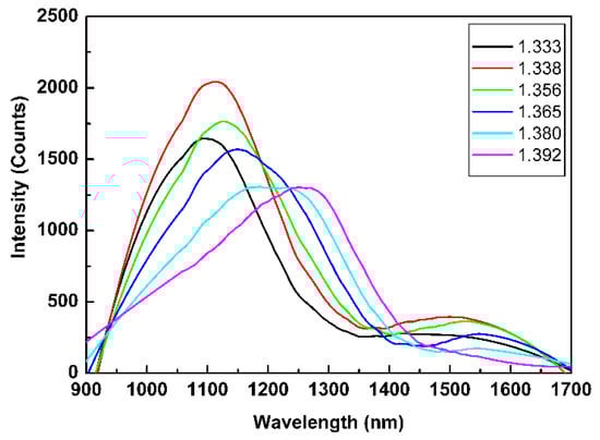 When the RI of the surrounding medium changes, the effective refractive index of light propagating in GZO film will vary. For LMR-based RI sensor, the resonance wavelengths shift due to the change of phase-matching conditions. Figure 6 shows the spectral response of a D-shaped fiber sensor with different RI solutions. We changed the RI of the sensing solutions in the sensing section. The proposed fiber-optic RI sensor has an obvious LMR absorption peak when the transmitted spectrum is in the range of 1050–1300 nm. It should be noted that the refractive indices of the sensing solutions were measured using an Abbe refractometer. The range of the refractive indices of the sensing solutions was 1.333 to 1.392. The fiber-optic sensing region was immersed into sensing solutions, and the transmission spectrum data was saved, respectively. The variation in the transmitted optical spectrum of LMR fiber sensor with GZO coating was measured from different concentration NaCl solutions. This result shows that the surrounding refractive index (SRI) is increased, the transmission spectrum of LMR fiber sensor reveals resonance absorption peaks toward longer wavelengths.