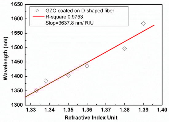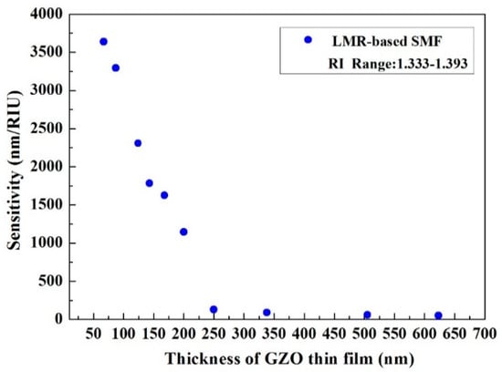 As mentioned in the literature [], the sensitivity of an LMR-based sensor increases with the SRI. The resonance wavelength of the LMR sensor generated with a GZO coating is represented as a function of the RI. Figure 7 depicts the sensitivity of LMR-type RI fiber-optic sensor. A red-shift in the spectrum was observed and the resonance wavelength shift was 214.6 nm, as shown in Figure 7. By taking the curve fitting, the highest sensitivity of the proposed LMR-type sensor was 3637.8 nm/RIU. Here, RIU means a refractive index unit. A resolution of 2 × 10−5 RIU was achieved. This work demonstrated an improvement of 25 times in sensitivity with respect to a previous publication by using a D-shaped long period fiber grating (LPFG) sensor []. When these results were summarized, we found that GZO coated onto the D-shaped fibers supported the generation of LMR absorption peaks. As the surrounding refractive index sensing solutions changed, the LMR absorption peak shifted toward the longer wavelength side. The results show the sensitivity of the LMR-type fiber sensor is about 4.8 times higher than that of ZnO based LMR sensor []. The performance of LMR-type sensors can be obtained using a curve fitting method to determine the sensitivity corresponding to the thickness of GZO films. These results also reveal that the thickness of GZO thin film grew thinner, while the sensitivity of the LMR-type sensors increased. The sensitivity of LMR-type sensor as a function of thin film thickness is shown in Figure 8. Film thickness is an important factor to affect LMR sensor’s performance.