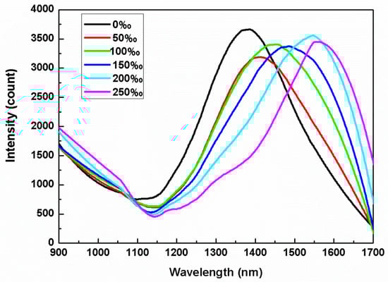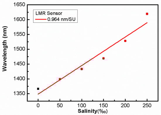 The LMR-type RI sensor is able to detect the salinity variations. The experimental setup is the same as discussed in RI sensing. The transmission spectrum of the LMR type fiber-optic sensor is represented as a function of the NaCl liquid salinity, as shown in Figure 9. This device shows a resonance wavelength (LMR wavelength) that has a red-shift for higher surrounding salinity indices in salinity ranges from 0 to 250%. It can be seen that the total shift in the resonance wavelength is about 194 nm. Villar et al. [] reported that the variation of the imaginary part (extinction coefficient k) in thin film affects the shape of the LMR curves. The sensitivity is a function of salinity units (SU) as shown in Figure 10. The experimental results show the sensitivity of an LMR-based salinity sensor is 0.964 nm/SU. The correlation coefficient of linearity is high enough to evaluate the degree of salinity. In this study, GZO thin film has been demonstrated as an LMR material for RI and salinity measuring applications. Therefore, the use of sputtering GZO thin film as supporting material for various LMR-type sensors is feasible in the current work.