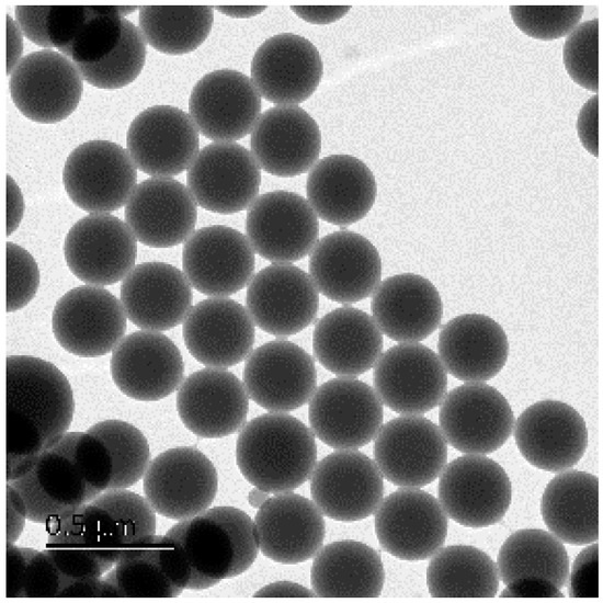 Monodisperse latex spheres of P(St-MMA-AA) were prepared by single-step emulsion polymerization. The mechanism of nucleation of the latex spheres could be considered to be homogeneous nucleation [31,32,33]. A latex sphere with a hydrophobic polystyrene core and hydrophilic P(MMA-AA) shell was synthesized [34], as shown in Figure 1. The concentration of the emulsion for this image was 0.6%. The polystyrene (dark part) was surrounded by P(MMA-AA) (light part). The spherical form showed the dependence of particle morphology on the MMA-AA/St ratio. The intensity-average hydrodynamic diameters of the spheres were 295.03, 289.66, 278.33, 278.15, and 258.96 nm when the SDBS in the emulsion polymerization system was 0, 0.005, 0.01, 0.015 g, and 0.02 g. The measured diameters from the TEM results were 285, 254, 230, 223, and 193 nm. These results illustrated that the diameters of spheres could be controlled by changing the amount of emulsifier in the polymerization system. The diameters measured with TEM were slightly smaller than the hydrodynamic diameters measured by DLS, similar to Tang et al. [11] and Ríos-Osuna et al. [27]. This phenomenon could be explained by the weak aggregation of the spheres and water loss shrinkage of the shell of spheres. In Figure 1, the diameter of the latex sphere was about 285 nm and the thickness of the shell part, formed from P(MMA-AA) with abundant COOH groups, was about 45–50 nm. The hydrophilicity of the co-monomer was the main parameter that influenced the morphology of the latex sphere. The outermost shell of the sphere was different from its core, wherein it was enriched with polar groups due to some degree of phase separation [35]. According to the literature, a significant decrease in the size of latex spheres after sample drying was observed when compared to the swollen and hydrated form in an aqueous medium. It was proposed that the change in size was primarily due to the evaporation of water from the PMMA and PAA rich peripheries of the spheres. Meanwhile, the spherical shape was effectively perceived to be the result of a dense PSt rich core.