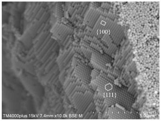 Meanwhile, the hydrophilic P(MMA-AA) shell merged into a continuous matrix in an aqueous system. The shell part of the latex spheres assisted self-assembly of the particles in forming a close-packed ordered structure [35]. Then the latex spheres in the emulsion are assembled layer-by-layer to the first layer, which acts as a seed. At the same time, part of the sphere’s sediment in the cell cavity of the wood surface under the action of gravity. The monodispersity of the spheres maintained the well-ordered arrangement during the fabrication of the photonic crystals [40]. Meanwhile, the hard and hydrophobic cores maintained the crystalline order structure [40,41]. These factors accelerated the arrangement of well-ordered latex spheres and contributed to the homogeneous colloidal photonic crystals on the wood surface.