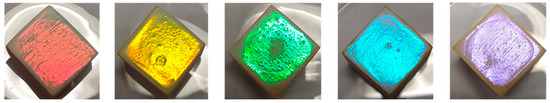 When photonic crystals are used as surface finishing materials, the coatings exhibit brilliant colors [41,42] due to the stop bands laying in the visible region. In this work, red, yellow, green, cyan, and violet photonic crystal coatings were prepared on the wood surface using P(St-MMA-AA) latex spheres with diameters of 285, 254, 230, 223, and 193 nm measured using the TEM image, respectively. The color was consistent throughout the woodblock surface due to the well-ordered arrangement of spheres. The diameter modulation of the monodisperse latex spheres was variated by altering the ratio of emulsifier (SDBS) in the emulsion polymerization process. The emulsifier SDBS was distributed around the surface of the latex spheres, which ensured the formation of a stable emulsion system. Figure 8 shows a photograph of the coatings deposited on the wood surface. The amount of drop per square centimeter was 110 μL. The area of the coating was ca. 2 × 2 cm2 and could be modulated with the size of the substrate. The brilliant structural colors of the coatings showed dependence on the viewing angle.