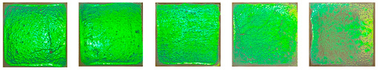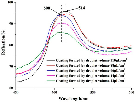 We explained the influence of coating thickness on the structural color as the droplet quantity varied. Figure 11 shows the reflectance spectra of the coatings formed from the emulsions of different concentrations. The as-prepared photonic crystal coatings were formed from P(St-MMA-AA) latex spheres with diameters of 230 nm. The number of spheres for self-assembly on the wood surface varied with the volume of an emulsion having the same concentration. Coatings with different thicknesses could be constructed on the same area of the wood substrate with different quantities of drops. In the image, the intensity of the reflection peaks decreased as the drop amount decreased. This phenomenon indicated that as the number of latex spheres increased, coating thickness and more effective crystal structures with a long-range ordering of latex spheres appeared. Figure 12 shows the images of coatings with different thicknesses. The coatings showed uniform structural color and excellent reflectivity. Coatings formed from more latex spheres completely shaded the wood surface and exhibited a more complete and bright color. It was worth noting that the reflection peaks red-shifted when the droplet amount increased from 66 to 88 μL/cm2. The reflection peaks appeared at wavelengths of 508 nm (22, 44 and 66 μL/cm2) and 514 nm (88 and 110 μL/cm2). This phenomenon could be attributed to the cellular structure of the wood surface. In Figure 12, the coatings formed from 22, 44 and 66 μL/cm2 droplet amounts could still retain the texture of the wood cellular structure. When more drops were used to make coatings, the surface of coatings showed more distinct photonic crystal structures and cracks could be seen in the image.
