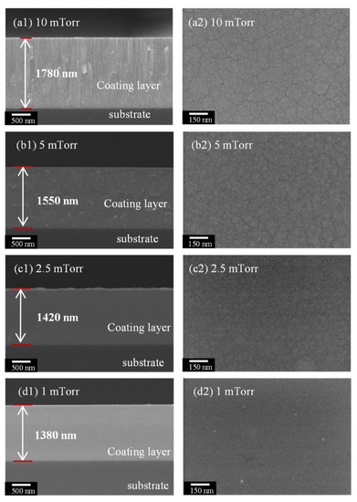 Cross-sectional and surface FE-SEM micrographs of the Mo–Si–N coatings deposited at various working pressures of (a1,a2) 10, (b1,b2) 5, (c1,c2) 2.5, and (d1,d2) 1 mTorr, retaining the N2 gas flow ratio of 25%.
