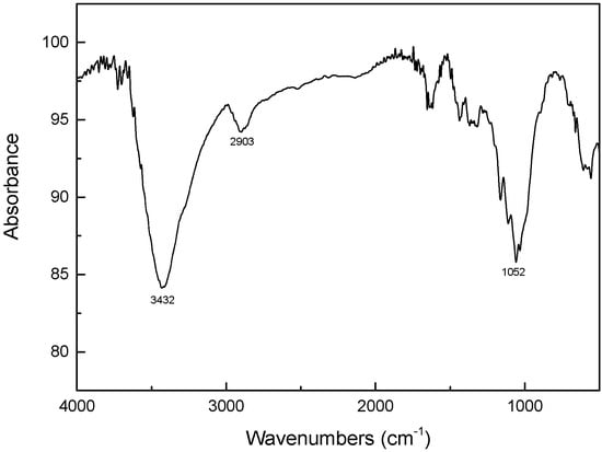 The infrared spectrum of CNC/GM sol mixtures (Figure 2) indicates that there was a broad and strong absorption peak near 3432 cm−1, which belongs to the stretching vibration peak of –OH [50]. There was an obvious C–O stretching vibration peak at 1720 cm−1 and an obvious C–OH stretching vibration peak at 1380 cm−1. There was a C–H tensile vibration peak near 2903 cm−1. The C–O stretching vibration peak at 1052 cm−1 was also relatively strong, indicating the presence of GM in the dispersion [51,52]. However, the FT-IR spectra alone will not be able to tell whether or not the GM could be successfully grafted to the surface of CNC to form chemical bonds.