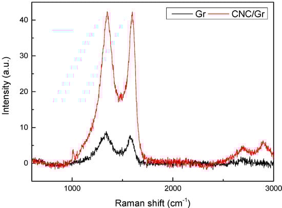 The Raman spectrum of graphene is composed of many characteristic peaks, such as G peak, D peak, G’ peak, etc. G peak appearing near 1580 cm−1 is the main characteristic of graphene materials, which can effectively reflect the number of layers of graphene but be affected by stress [53]. D peak near 1350 cm−1 is the disordered vibration peak of GM. G’ peak near 2700 cm−1, also known as 2D peak, is used to characterize the inter-layer stacking mode of carbon atoms in GM [54]. Figure 3 indicates that G, D, and G’ peak signals observed in the CNC/GM sol mixtures were all stronger, indicating that the graphene flakes were evenly dispersed in CNC sols. The ID/IG ratios were 0.853 and 1.001 for GM and CNC/GM sol mixtures, respectively. The value of ID/IG ratios increased from 0.853 to 1.001, and the peak strength was significantly increased, and 2D peak occurred at 2700 cm−1 in the Raman spectrum of the CNC/GM sol mixtures, which was caused by coupling between graphene sheets. These experimental results indicated that the graphene materials were deposited on the surface of cellulose nanocrystals, implying a good dispersion of graphene materials in the CNC sols.