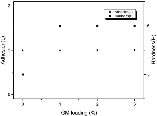 Adhesion and hardness were important properties of coatings, which were related to the durability and long-term performance [56]. In particular, it was required that the addition of CNC or GM did not worsen the adhesion characteristics of coatings for the actual using reason. Any particle or nanoparticle added to the coating would be expected to impact these properties and the system should behave as a true composite [57]. This experiment revealed that the adhesion strength of coatings with or without the addition of CNC/GM being practically at the same high level. Figure 6 indicates that the adhesion strengths of all coated samples being in the level 1, and the hardness of coatings with and without CNC/GM modifier added all meet the critical values outlined in standards, respectively. The higher GM loading yielded a harder coating (6H) than the control one (5H). This test revealed no significant difference of hardness between coatings with different GM additions, which was because GM was simply dispersed but not covalently bonded to or within the continuous phase, resulting in no increase of hardness [58].