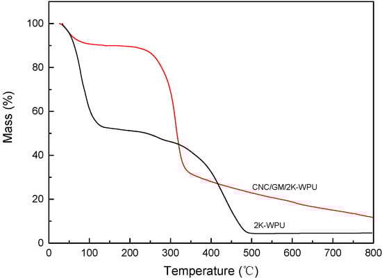 The TG curves of the 2K-WPU and CNC/GM/2K-WPU coatings (Figure 8) indicate that the decomposition temperatures (Td) of 2K-WPU coatings at 10%, 50%, and 80% mass losses were 51, 322, and 453 °C, respectively. The decomposition temperatures of CNC/GM/2K-WPU coatings at 10%, 50%, and 80% mass losses were 251, 322, and 681 °C, respectively. The results showed that the CNC/GM/2K-WPU coatings had better thermal properties than 2K-WPU coatings, indicating that the addition of graphene materials could further improve the thermal resistance property of 2K-WPU coatings. This is because graphene materials have their initial decomposition temperature over 2800 °C under vacuum [63,64]. Meanwhile, the reaction between oxygen-containing functional groups such as hydroxyl in the composite system can improve thermal stability [60]. When the decomposition temperature increased from 300 to 430 °C, the mass losses values of CNC/GM/2K-WPU coatings were higher than the ones of 2K-WPU coatings, indicating that partial modifiers (CNCs) in coatings had begun to degrade. Particularly, the initial decomposition temperatures (Td) of CNCs are about 360–600 °C [65].