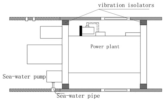 Thermodynamic underwater vehicle power system includes the main engine and multiple auxiliary engines. As shown in Figure 1, the power plant is integrated and supported to the housing through front and rear vibration isolators. The basic function of the vibration isolators is to support the entire power plant, which are called “supporting devices”. In addition to vibration isolators, there are also some pipes connected auxiliary engines to the housing, such as sea-water pipes, fuel pipes and oil pipes. The main function of these pipes is to complete the transportation of seawater, fuel and oil, without support functions, collectively referred to as “un supporting devices”. The mechanical vibration of power plant during operation transmit to the housing through these supporting and unsupporting devices, and then generate radiated noise in the ocean. The sea-water pump is one of the major vibration and noise sources in the underwater vehicle power system. There are two basic directions to decrease the impact of the sea-water pump generated vibration for the whole vehicle in practical engineering, the first is reducing the vibration of the pump itself, e.g., reduce rotting speed and the optimized structural form. The second is decreasing the vibration transmission in the transfer path. Compared with reducing the vibration of the pump, which needs to sacrifice pump power and increase development cost, the same effectiveness can be achieved from the transfer path without affecting the performance of the product.